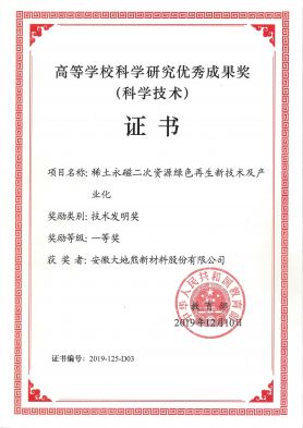 Earth-Panda always insists on taking "scientific and technological innovation" as the foundation of the enterprise. Through independent research and development, introduction of technologies, transformation of scientific and technological achievements and industry-university-research cooperation, it has formed an advanced technological innovation system and core competitiveness of the enterprise and has attained many excellent achievements in preparation method, surface protection, processing and inspection and testing of rare earth permanent magnet products. The company has been licensed 148 patents and 54 domestic and foreign inventions, led the formulation of 1 national standard of Regenerated NdFeB Permanent Magnet Materials, and participated in the formulation and revision of 7 national standards such as Sintered NdFeB Permanent Magnet Materials. It has won one first prize, one second prize and one third prize of Anhui Provincial Science and Technology Progress Award as well as one first prize and one second prize of Technical Invention Award of the Ministry of Education, and won the titles of National Key New Products with 2 products, New Products of Anhui Province with 4 products and High-tech Products with 7 products.